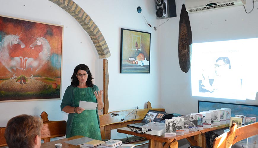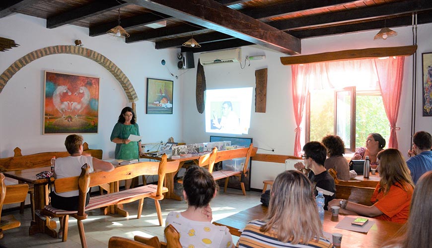 Dr. Horvát Futó Hargita, a Magyar Tanszék tanára a kishegyesi táborban Gion Nándor műveinek fordításairól tartott előadást, reflektált a fordítás és a kánon, a fordítás és az ideológia összekapcsolódásának problematikájára, és kitért néhány konkrét fordítói megoldásra.